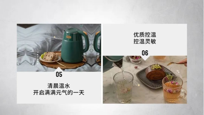 控温灵敏,沸腾自动跳断,煮水安心。高温防干烧保护,自动停止加热。两段阻尼式开盖,防止蒸汽瞬间冒出,有效避免灼热蒸汽,细心呵护每次开盖。