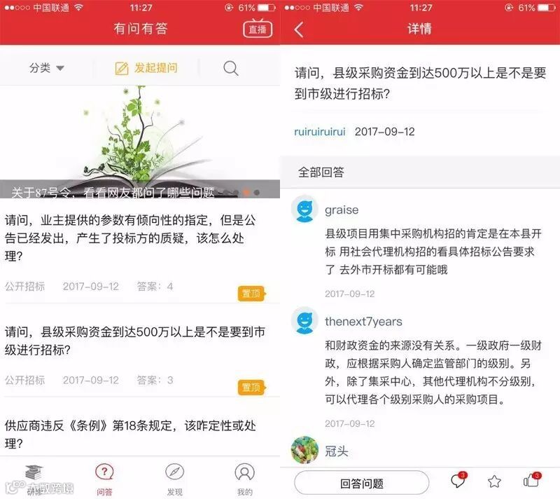 自易采通APP上线以来,“有问有答”频道就受到各方政府采购人士的喜爱,短短8个月时间,“有问有答”频道已收集了3000多个政府采购一线人士遇到的疑难问题及专家同行给出的解决方案。