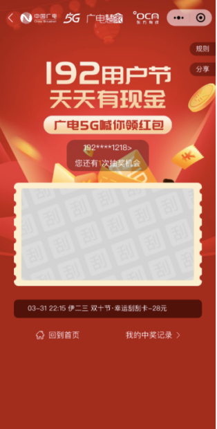 设置好192手机号后回到首页,点击192用户节轮播图进去活动页面即可挂卡抽奖