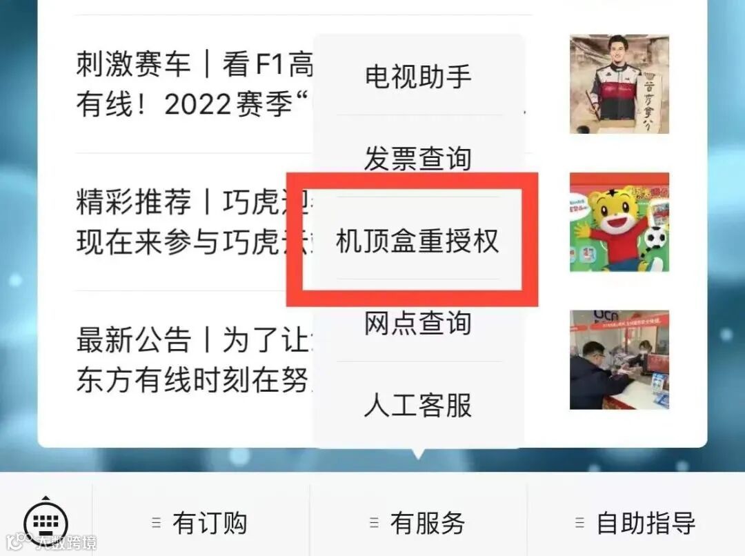 您可以通过微信服务号在线自助重授权呢。选择下方【有服务】- 【机顶盒重授权】就可以啦。