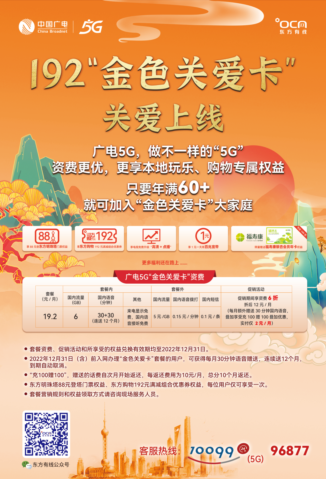 中国广电5G为广大长者提供优质的专属服务,只要年满60+在网用户就可加入“金色关爱卡”大家庭,享受各种专属福利!