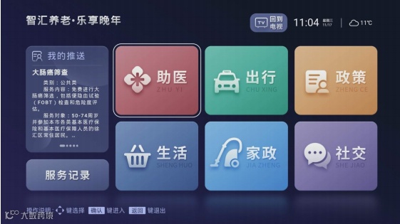 我们在松江、徐汇、普陀部分区域试点智慧信息化养老服务,为老年用户提供智慧养老解决方案,打造为老服务“一键通”,让老年朋友用简易遥控器,就能完成很多日常的需求。