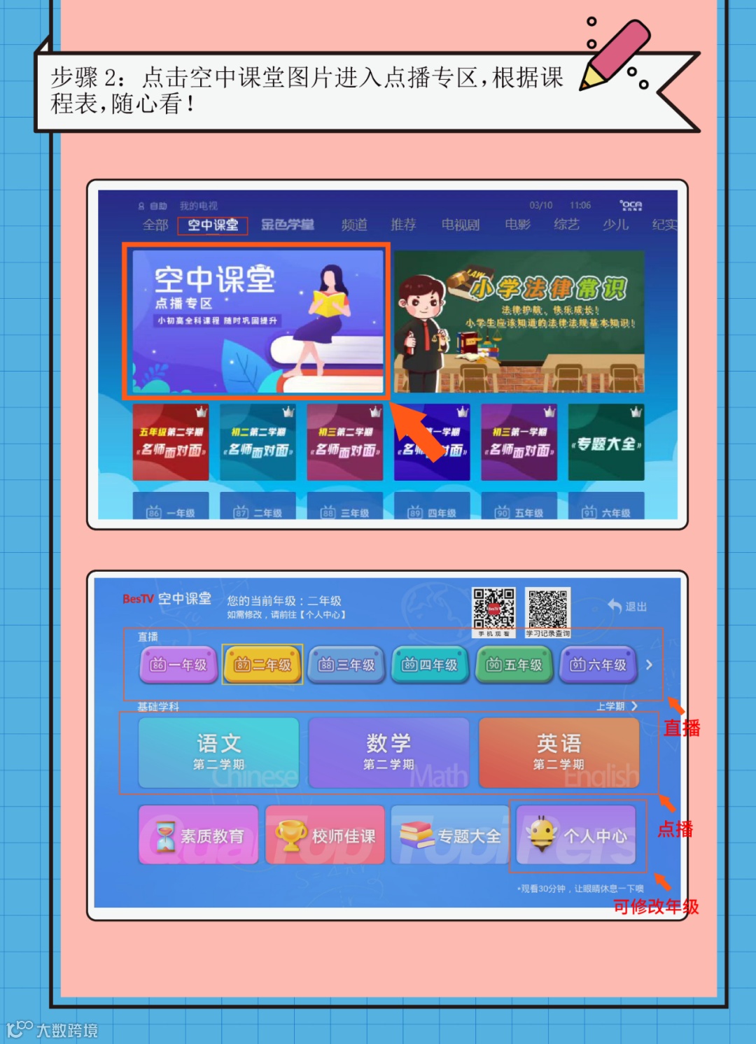 在频道列表中对应的年级频道。