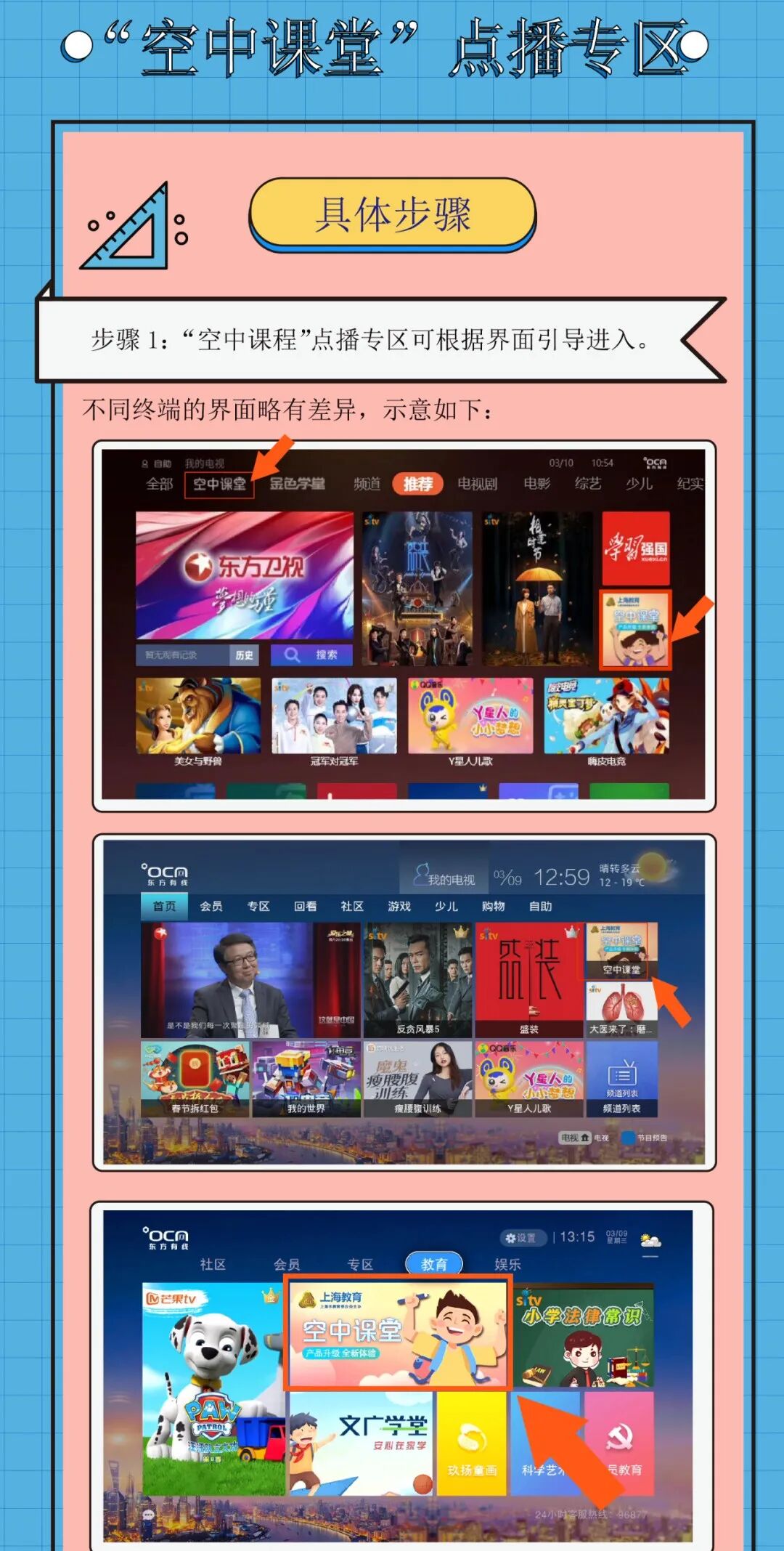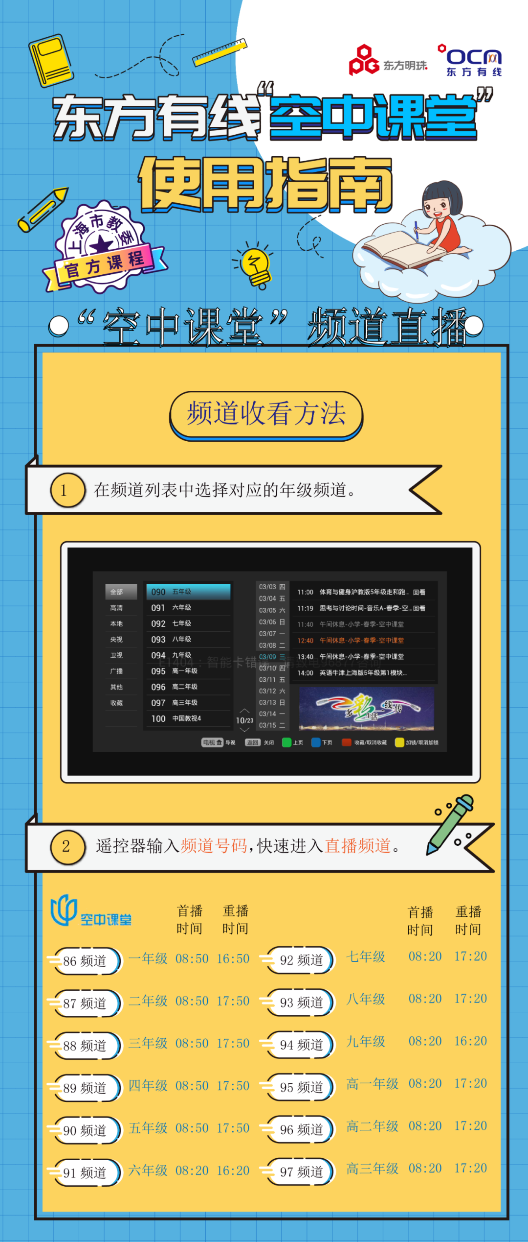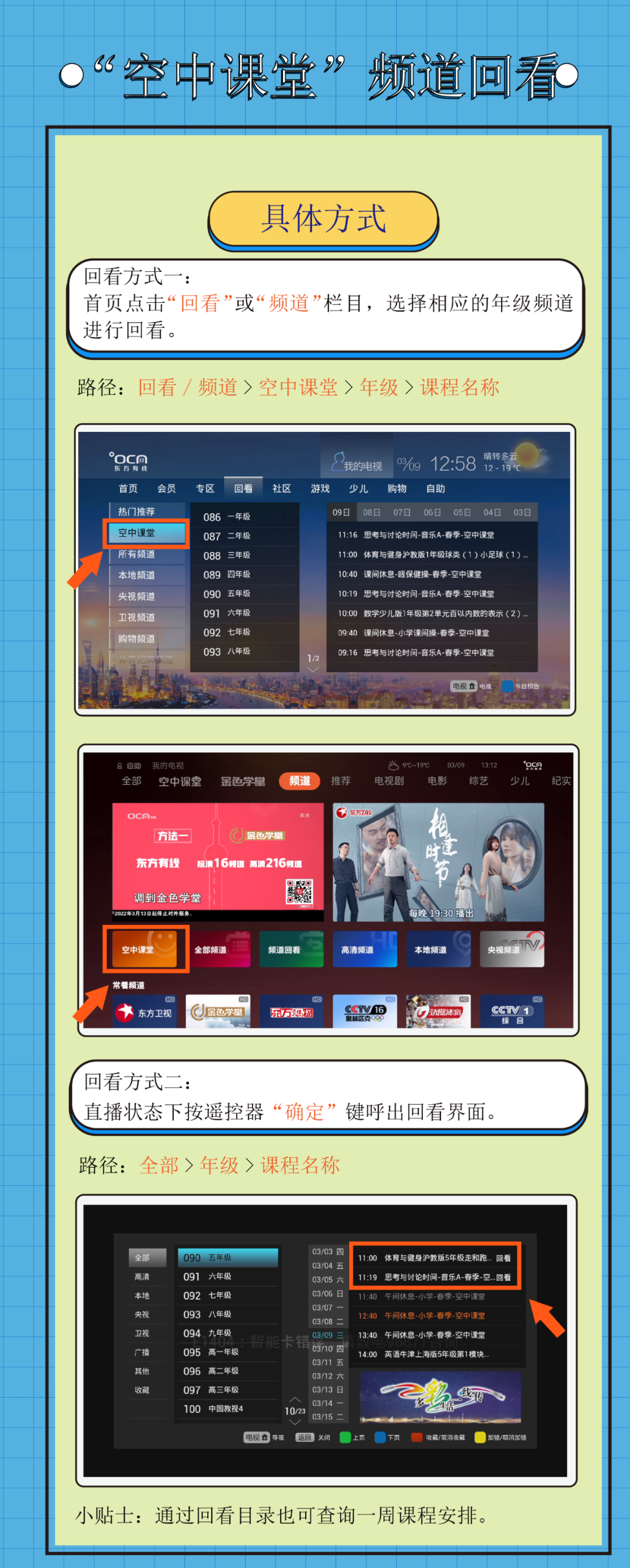 可通过东方有线的“空中课堂”频道进行直播收看、点播和回看,让您时时看,反复看。东方有线大屏以信号稳定、画面清晰、覆盖面广的特点,承担着“空中课堂”落地主要的播出渠道之一,广受用户好评。