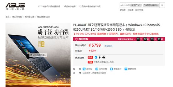 2017年8月英特尔发布了第八代酷睿处理器,笔记本电脑迎来了新一轮的产品更新。新一代处理器在移动平台上的性能提升尤为明显,或者可以说,此次更新对于轻薄的商务本来讲,的确是一次性能上的飞跃。而作为商务本的知名品牌华硕,积极迎合商务市场需求,在华硕商城推出了新一代商用笔记本PU404。3月8日-3月9日期间,华硕商用新品PU404直降300元,首发仅为5799元,限时两天,欲购从速。