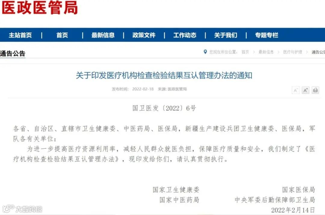 该条新规明确了医疗机构应按照“以保障质量安全为底线,以质量控制合格为前提,以降低患者负担为导向,以满足诊疗需求为根本,以接诊医师判断为标准的原则,开展检查检验结果互认工作。”