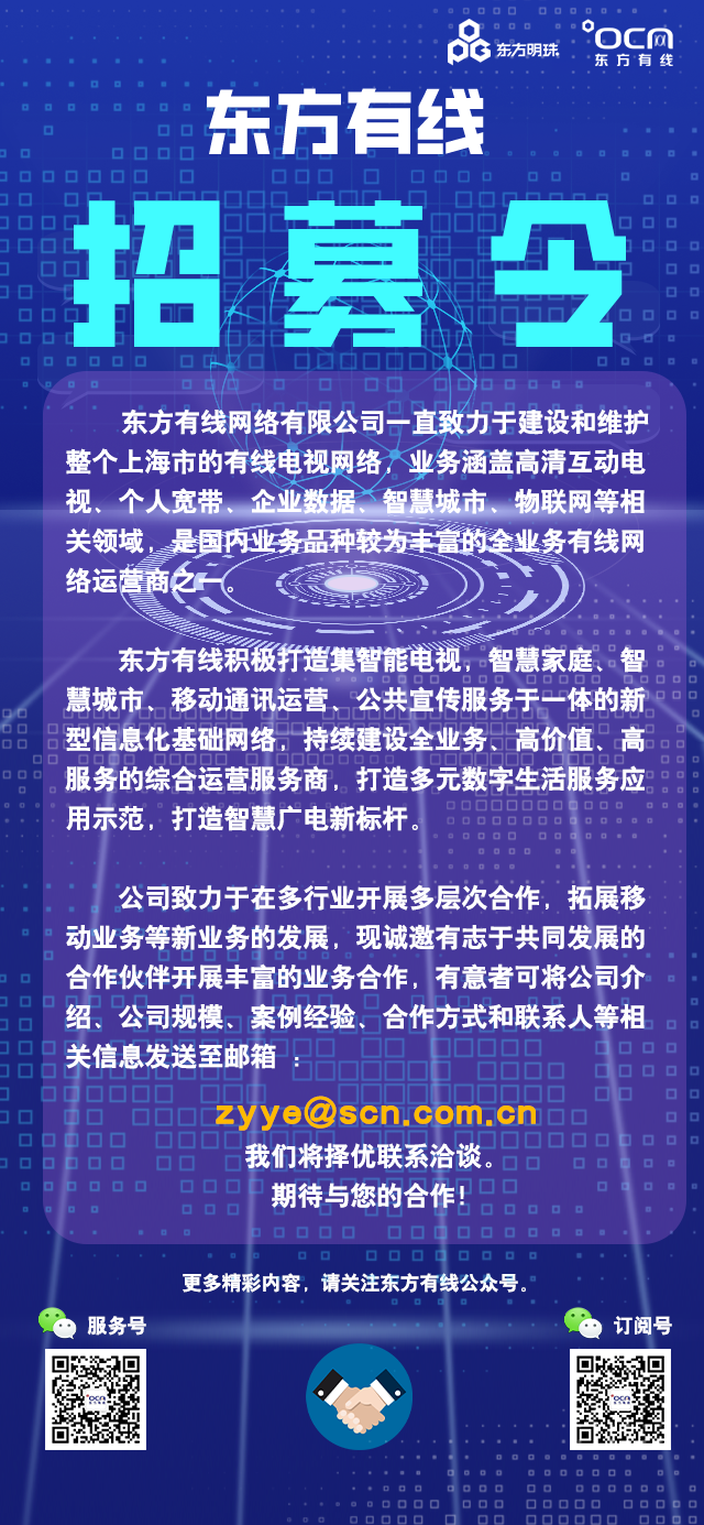 您可以点击最下方卡片关注东方有线官方微信公众号,点击服务-自助指导-招贤纳士-招募合作伙伴,或直接点击下方链接。