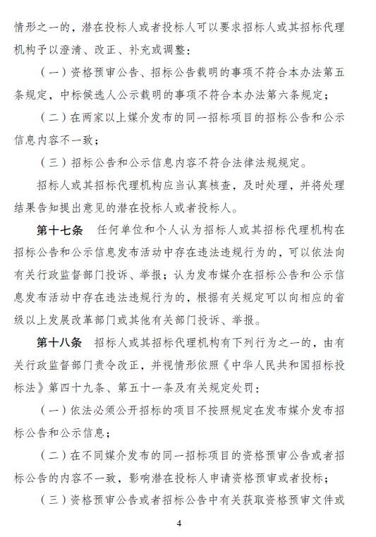 《办法》规定,依法必须招标项目的招标公告和公示信息有下列情形之一的,潜在投标人或者投标人可以要求招标人或其招标代理机构予以澄清、改正、补充或调整:(一)资格预审公告、招标公告载明的事项不符合本办法第五条规定,中标候选人公示载明的事项不符合本办法第六条规定;(二)在两家以上媒介发布的同一招标项目的招标公告和公示信息内容不一致;(三)招标公告和公示信息内容不符合法律法规规定。招标人或其招标代理机构应当认真核查,及时处理,并将处理结果告知提出意见的潜在投标人或者投标人。