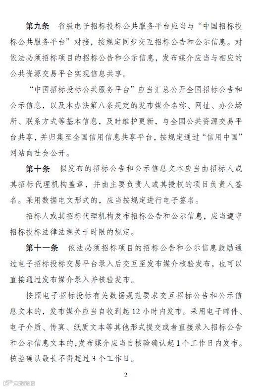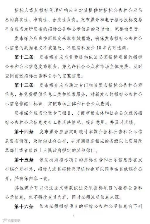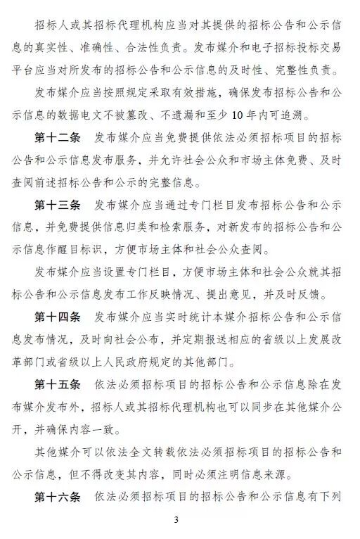 《办法》明确,招标人或其招标代理机构应当对其提供的招标公告和公示信息的真实性、准确性、合法性负责。发布媒介和电子招标投标交易平台应当对所发布的招标公告和公示信息的及时性、完整性负责。