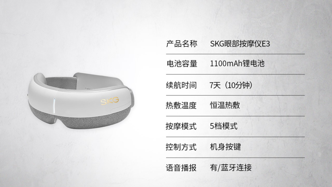 SKG眼部按摩仪E3,恒温42℃热敷体验,加速血液循环,给眼睛多一点温暖,无论您是上班族、游戏族,还是追剧党,SKG眼部按摩仪E3都是您的不二之选。