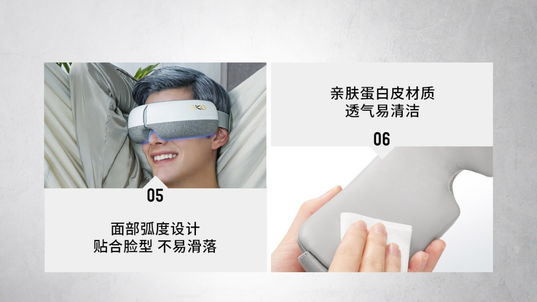 6大智能按摩气囊,针对丝竹空穴、晴明穴、太阳穴等穴位,采用多频震动揉压按摩手法,持续循环式震动按摩,给您按摩大师般的享受。