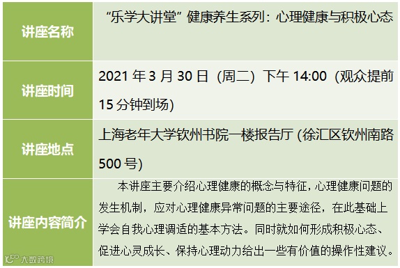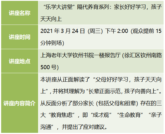 3月24日上海老年大学主办的“乐学大讲堂” ,由上海开放大学副校长王伯军主讲的《隔代养育系列——家长好好学习,孩子天天向上》定会让您受益匪浅。这里不仅能学到育儿经验,还能和其他同学一起分享带娃的经验,千万不要错过啊。