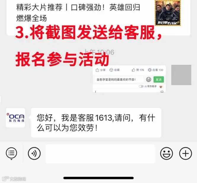 2:将评论或转发朋友圈的内容微信截图,发送至“东方有线“官微对话框内。