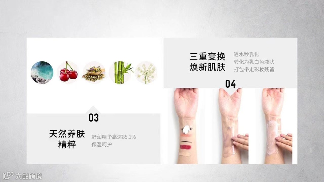 一秒乳化,细腻触感,清爽不闷痘,安全不刺激。天然植萃成分,给予肌肤更多滋润。浓妆淡妆,一步卸除焕新肌,无需二次洁面。