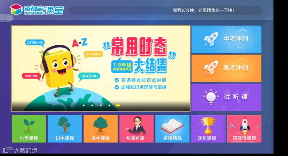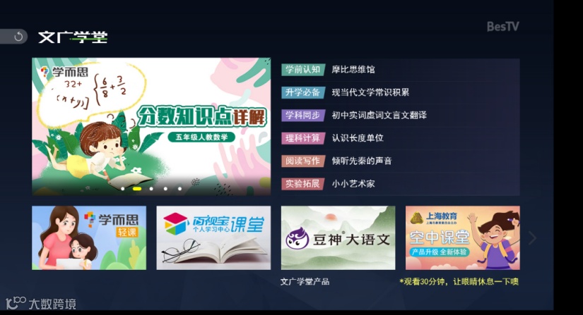 登陆“东方有线点播平台——文广学堂”,学而思、豆神大语文、华师大(百视宝)几大品牌一应俱全。