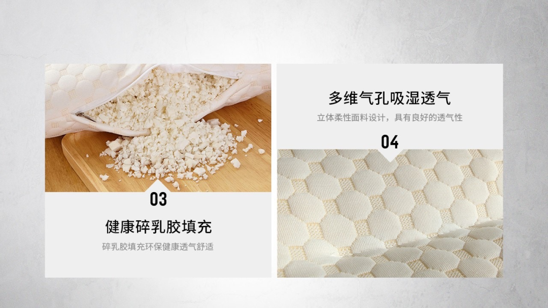 碎乳胶填充,流动性强,枕头各区域的高度可以自主调节。填充物环保健康、透气干爽,给大家一个舒适的睡眠环境。