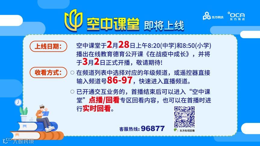 空中课堂3月2日正式开课,为了保障广大师生顺利收看,请家长提前做好各项收视准备和调试。您也可以通过关注东方有线微信公众号,通过自助指导——空中课堂栏目,及时了解“空中课堂”相关资讯。