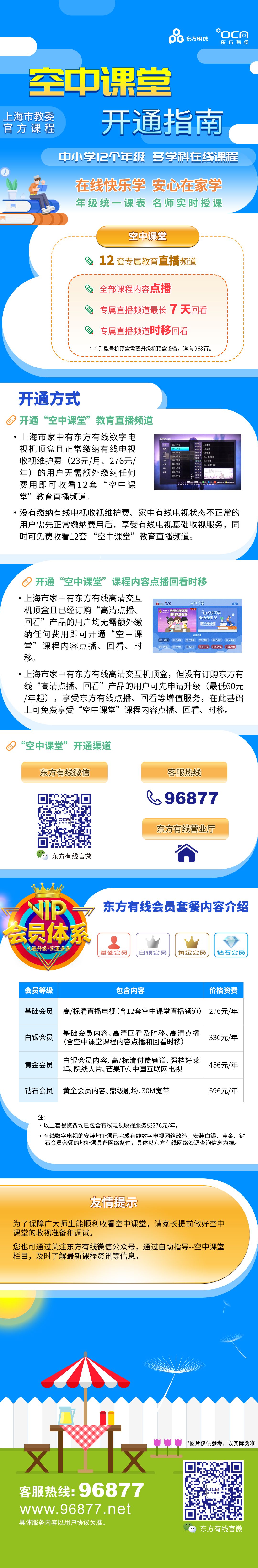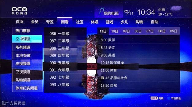上海市家中有东方有线高清交互机顶盒,但没有订购东方有线“高清点播、回看”产品的用户可先申请升级(最低60元/年起),享受东方有线点播、回看等增值服务,在此基础上可免费享受“空中课堂”课程内容点播、回看、时移。