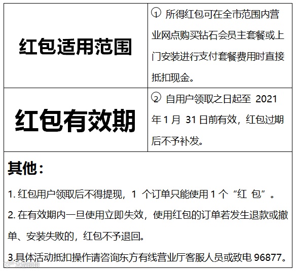 在获得刮刮乐红包后,东方有线用户可在全市范围内营业网点购买钻石会员套餐或上门安装时,直接抵扣现金。