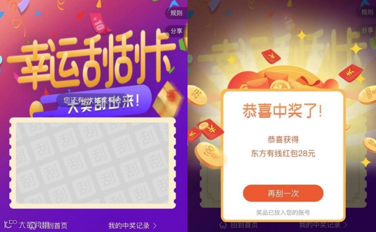 进入小程序,点击参与刮刮乐之后,获得礼物或红包
