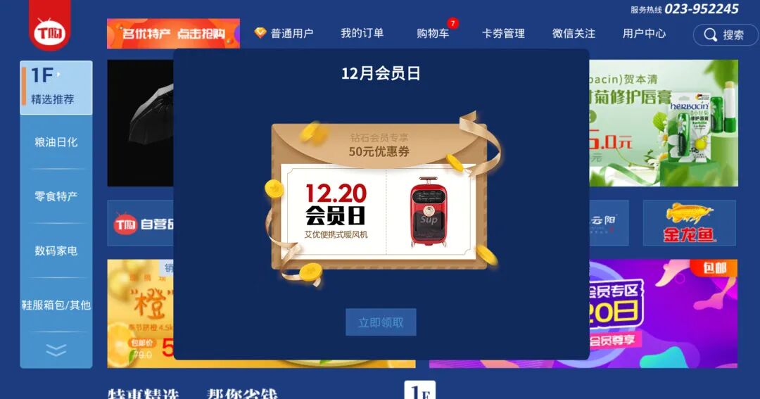 在TGO商城首页领取会员专属优惠券(不同会员等级将弹出相应面额的优惠券,仅限12月20日会员日当天领取及使用)