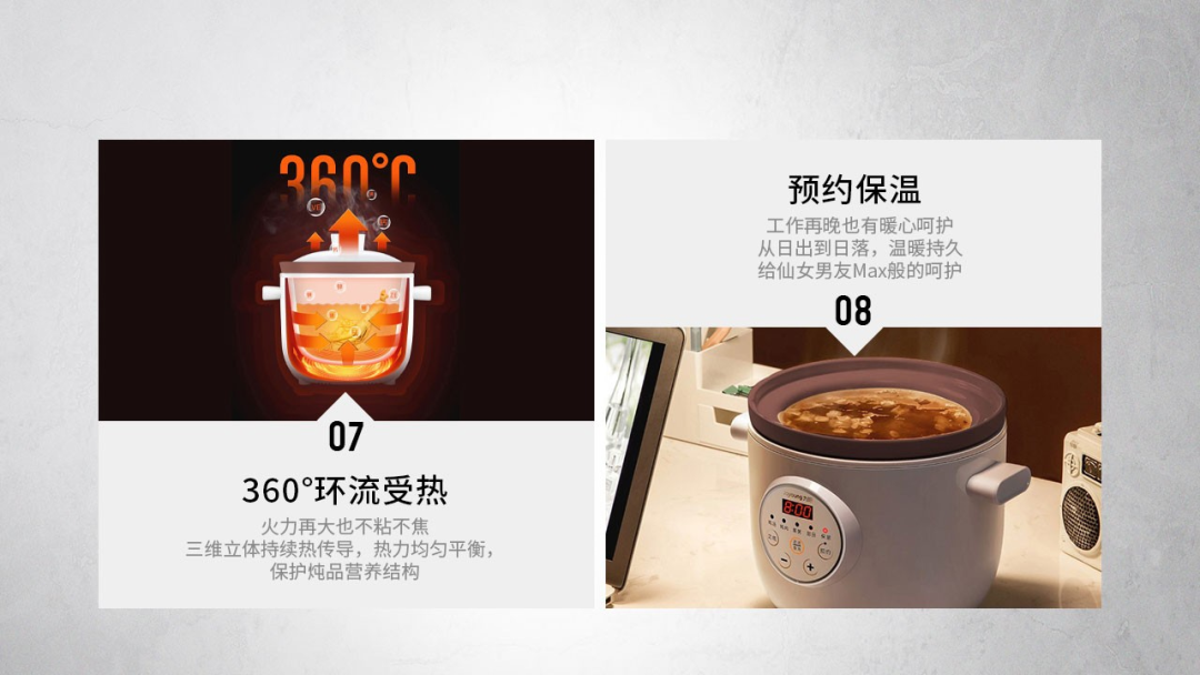 360°环流受热,火力再大也不粘不焦。三维立体持续热传导,热力均匀平衡,保护炖品营养结构。预约保温功能,让您工作再晚也能得到暖心呵护。