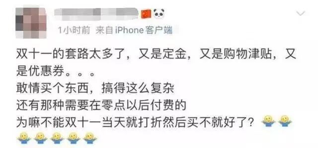 某些店铺搞出这么多花样,目的只有一个:让您觉得优惠了,省钱了,多买多消费。央视财经频道去年双十一的节目里也说了,各种优惠策略,就是尽可能的多网罗客户,但猫腻很多,所有优惠并不一定能叠加使用。算下来,压根没省多少。