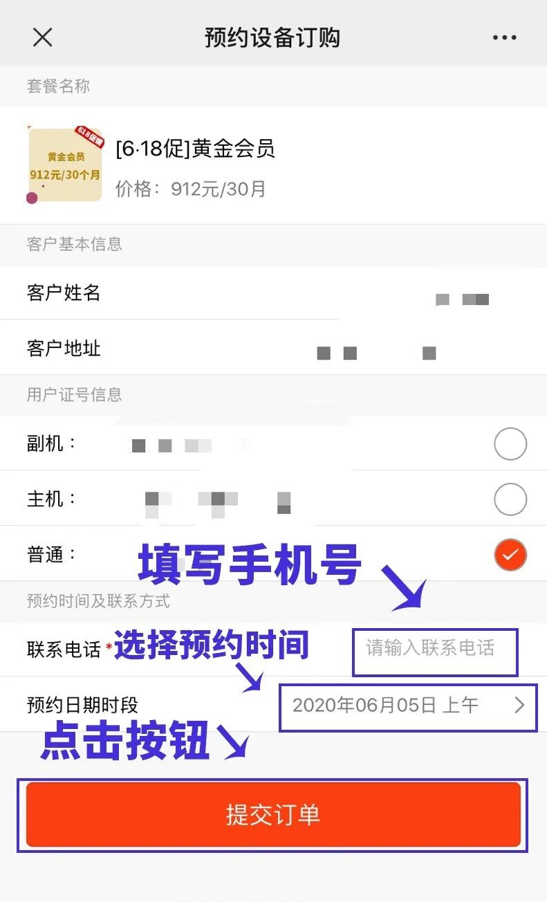 填写联系电话,选择预约时间,点击提交订单