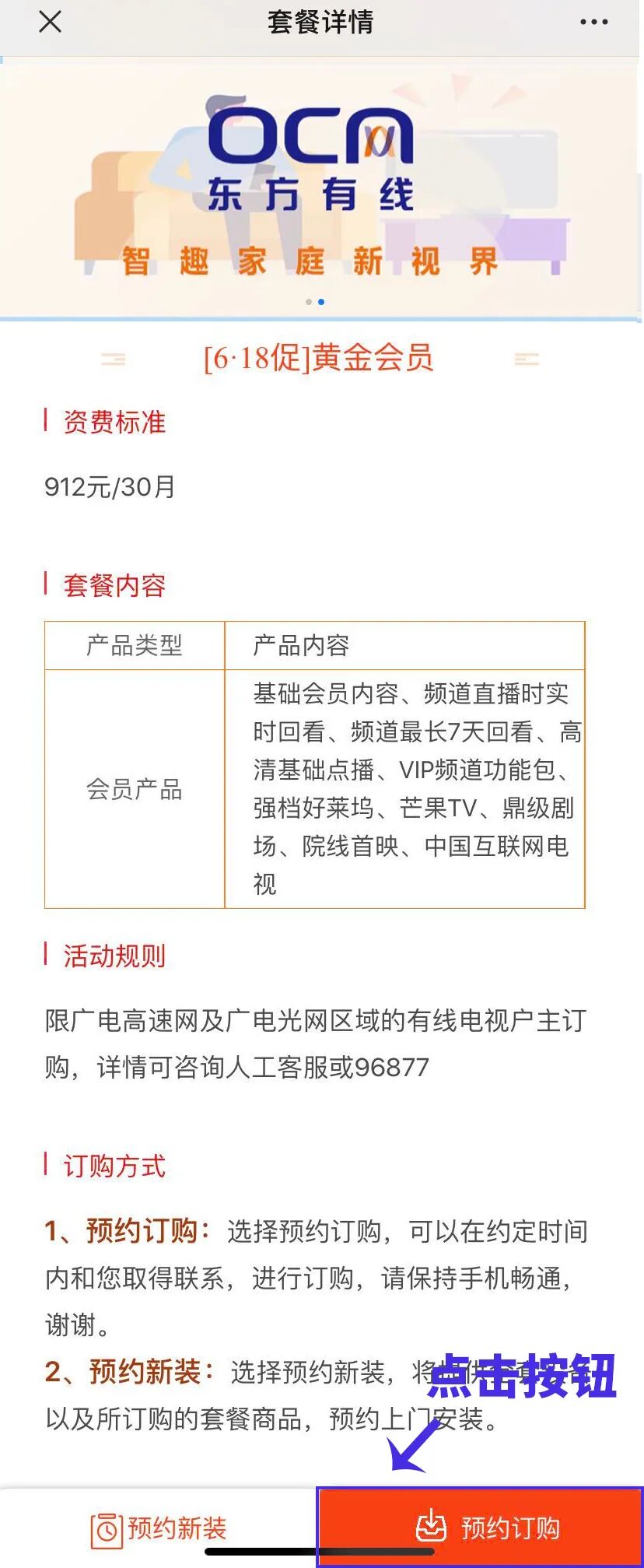 进入套餐订购页面,点击按钮预约订购