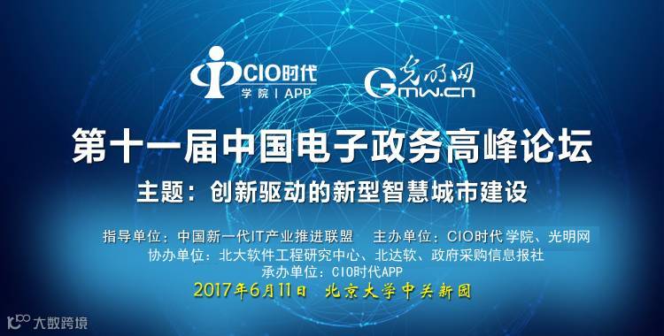 2017年6月11日,由CIO时代与光明网联合主办,中国新一代IT产业推进联盟指导,北大软件工程研究中心、北达软、政府采购信息报社协办,CIO时代APP承办的以“创新驱动的新型智慧城市建设”为主题的“第十一届中国电子政务高峰论坛”将于北京大学中关新园隆重拉开帷幕。
