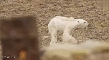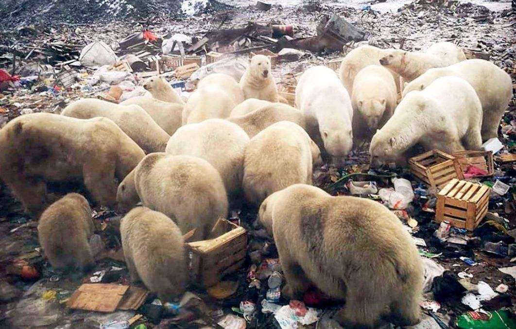 在北极,几只白绒绒的北极熊,在垃圾里面觅食。北极熊满身污垢,行动迟缓……