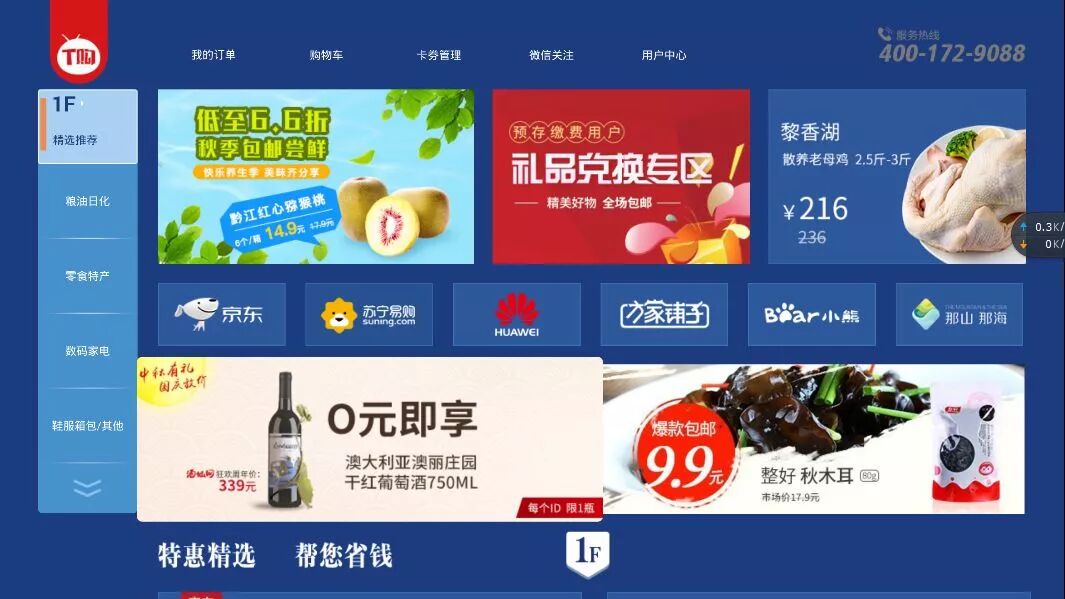 T购商城是重庆家乐淘科技有限公司自主研发的新媒体电商平台,老百姓无需注册、无需密码、无需绑定银行卡,通过电视就能购买到品牌热销、全国特产、全球精选等商品,让您足不出户,购全球好物!