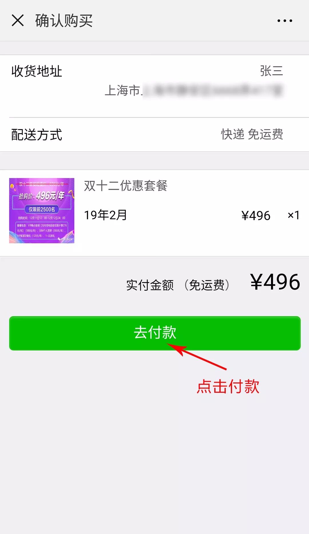 4.收货地址(即安装地址)填写完成后,点击去付款,恭喜您抢购成功!