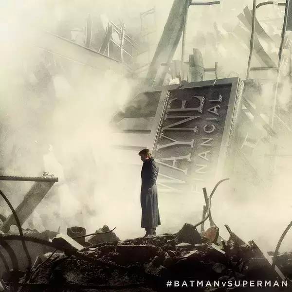 废墟中躺着韦恩公司的标牌,种种压力,让韦恩变得更偏执、强硬——