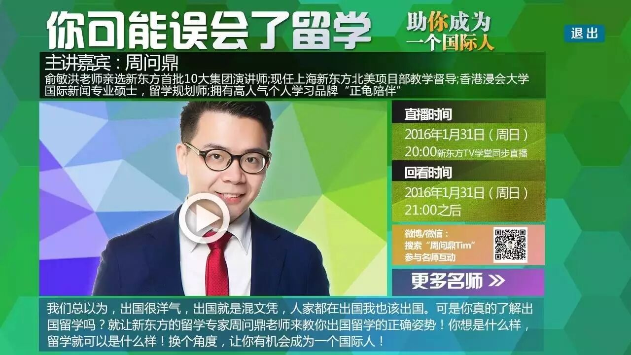 了解或不了解,坚决或犹豫都没有关系!新东方TV学堂1月31日(周日)晚八点独家全程直播,新东方留学专家周问鼎老师来教你出国留学的正确姿势!你想是什么样,留学就可以是什么样!换个角度,让你有机会成为一个国际人!