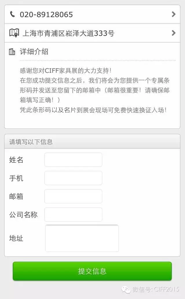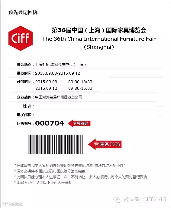 广大来宾观众!现在就可以通过「CIFF家具展」微信公众号预先登记,享受9月上海虹桥家具展简单便捷的免费入场了!
