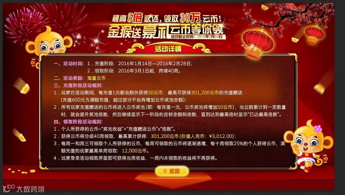 1.玩家在活动期间,每充值1元都会额外获得50云币,最高可获得301,200云币的充值赠送(充值600元为满额充值,超过部分不会再增加云币奖池金额);