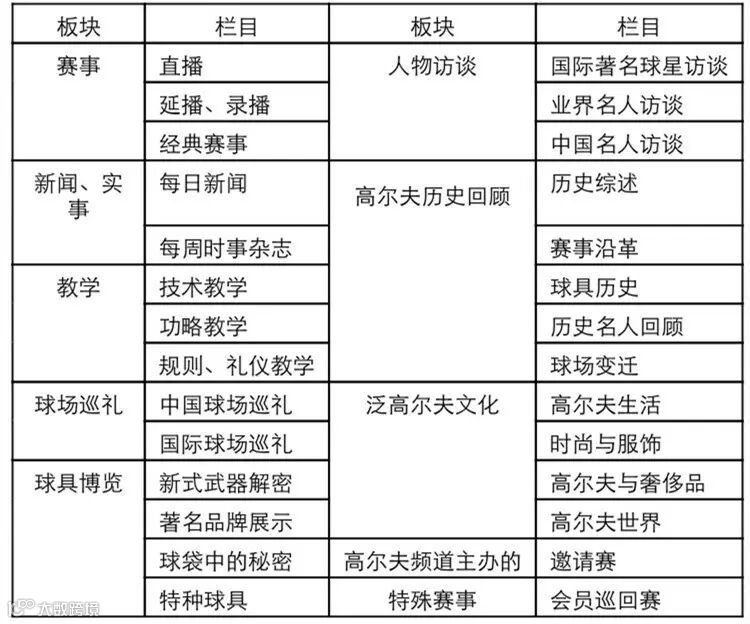 五大类王牌节目,全年42场赛事直播,全年34场赛事转播,365天高尔夫新闻速递,每日22分钟高尔夫教学,世界顶级赛事PGA(美巡赛)官方在中国大陆唯一全程直播媒体,全国唯一的24小时高尔夫电视频道。