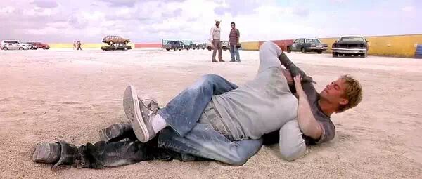 片中头一次飙车,惜败的结果让他乐呵呵的——但随后就是一碰冷水:街头车赛,赢家通吃,差一厘米也是把车输掉的结果。