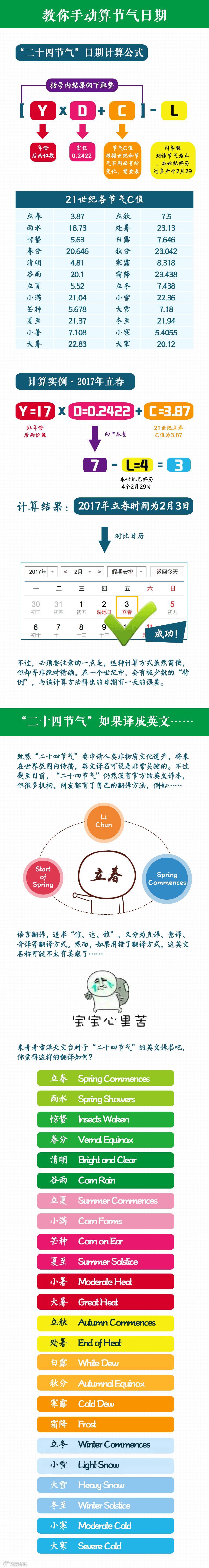 看完了上面这些,你可能会想,“二十四节气”的计算如此精准,肯定有一套非常精密、复杂的公式吧?实际上,“二十四节气”的精密计算虽然有着复杂的程序,但也有一套简便方法。看看下面的教学,一起做,你也能算出每个节气的具体日期。