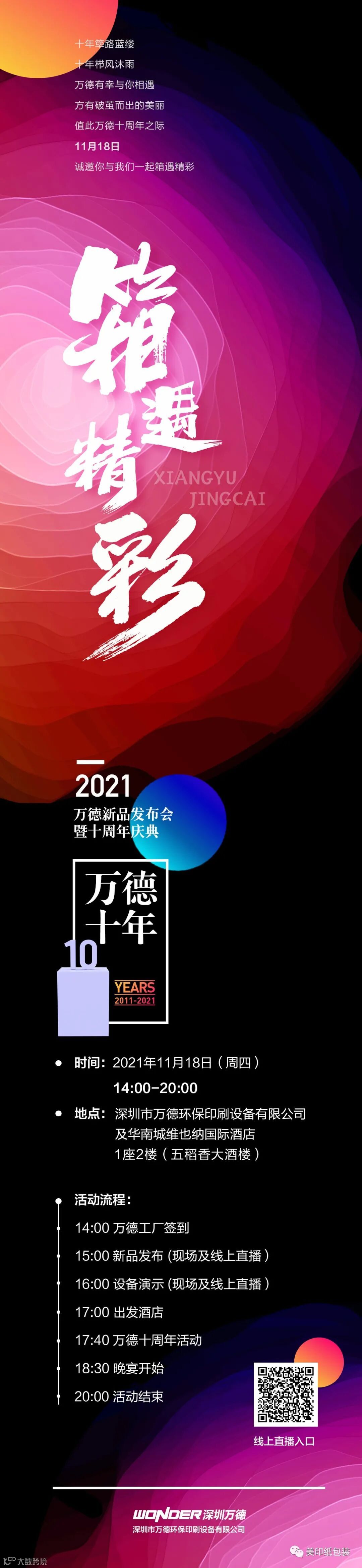 本次深圳万德“2021深圳万德新品发布会暨十周年庆典”活动,将通过现场参观及线上直播方式,首次展示最新研发的数码印刷设备以及分享万德未来发展战略。