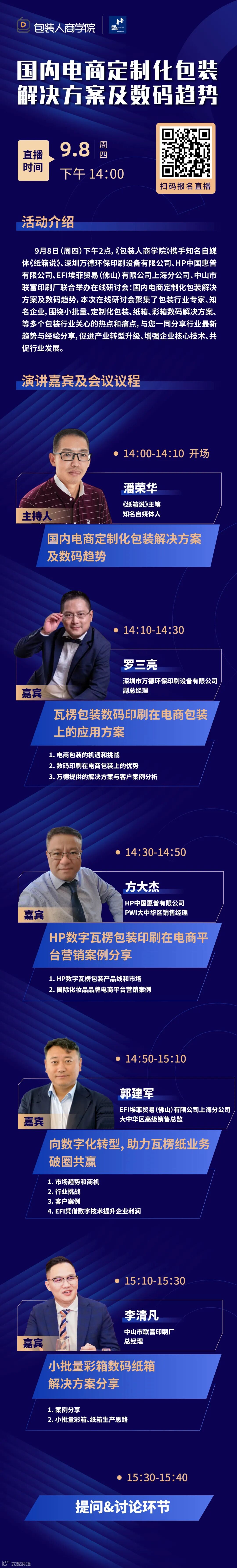 9月8日(周四)下午2点,《包装人商学院》携手知名自媒体《纸箱说》、深圳万德环保印刷设备有限公司、HP中国惠普有限公司、EFI埃菲贸易(佛山)有限公司上海分公司、中山市联富印刷厂联合举办在线研讨会:国内电商定制化 包装解决方案及数码趋势。