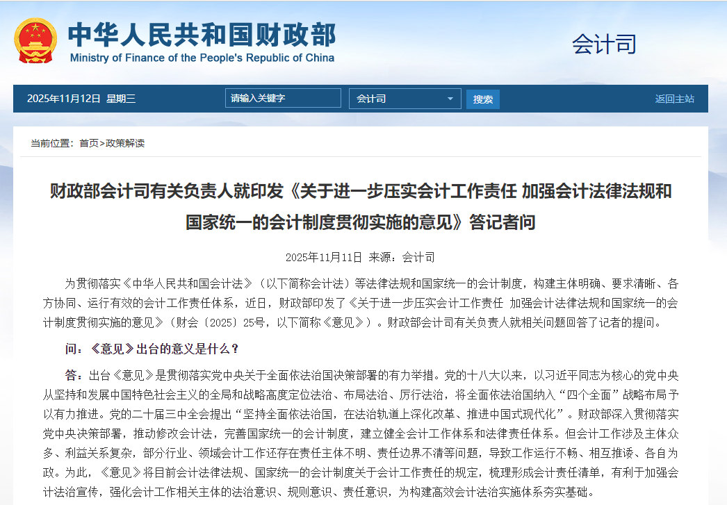 这次财政部发布的《关于进一步压实会计工作责任 加强会计法律法规和国家统一的会计制度贯彻实施的意见》(以下简称《意见》),堪称会计行业的「责任重塑指南」—— 老板、会计、软件商全覆盖!千万别理解为只是我们会计的工作责任,而是三方共同归位尽责!