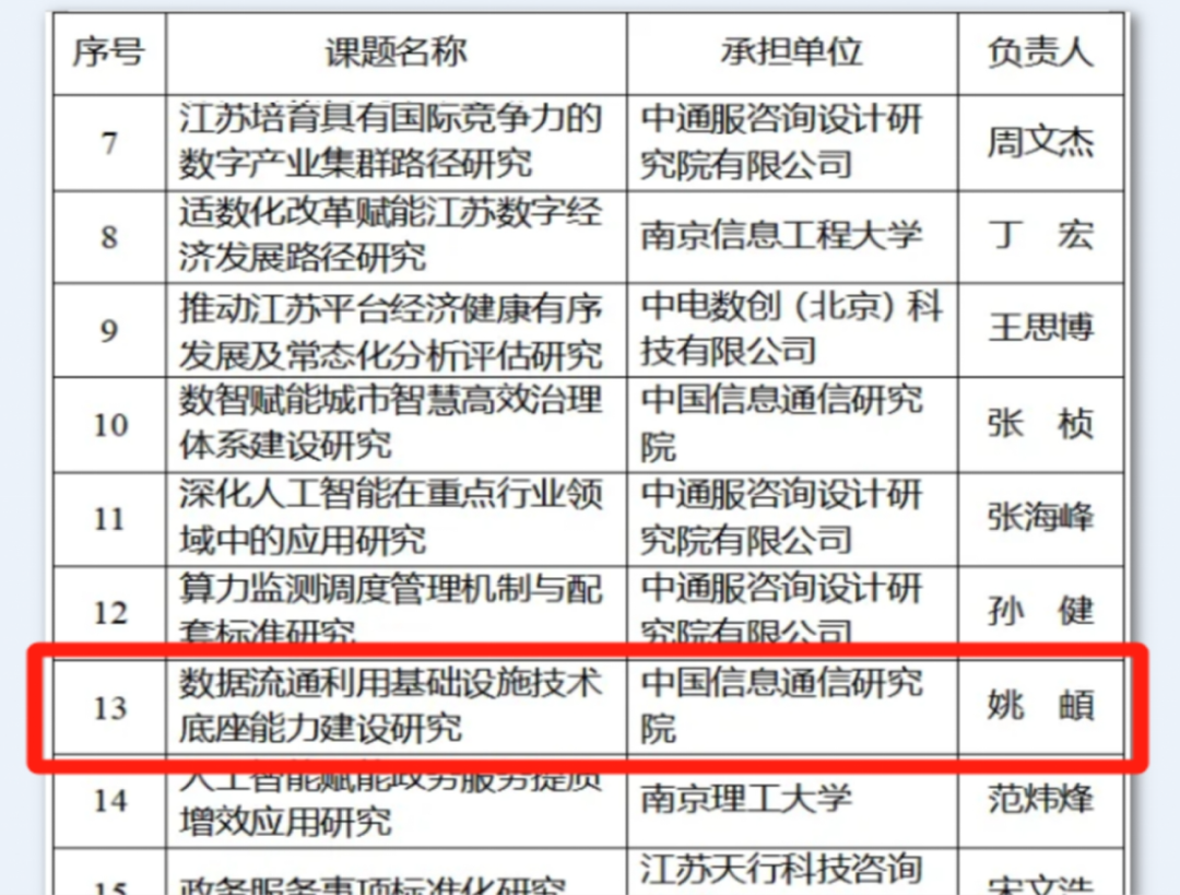 近日,江苏省数据局正式公布2025年度研究课题入选结果。在数据流通基础设施方向,中国信息通信研究院(以下简称“中国信通院”)申报的《数据流通利用基础设施技术底座能力建设研究》课题成功入选。