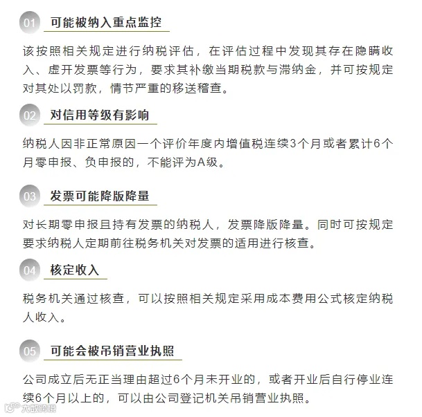 但是如果长时间不做税务申报,会导致企业的纳税信用等级降底,限制企业后期正常业务,不允许企业贷款,甚至罚款,拉入税务黑名单等。