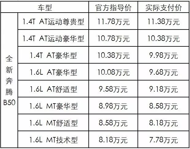 在发布会现场,一汽轿车销售有限公司总经理崔大勇先生公布了全新奔腾B50八款车型的官方指导价格。本年度12月31日前购车用户还有特大惊喜,在享受国家1.6L以下排量乘用车购置税减半的优惠政策基础上,一汽奔腾还将给出4000元每辆的购置税厂家补贴政策,相当于享受“0”元购置税。官方指导价及用户购车实际支付价为:
