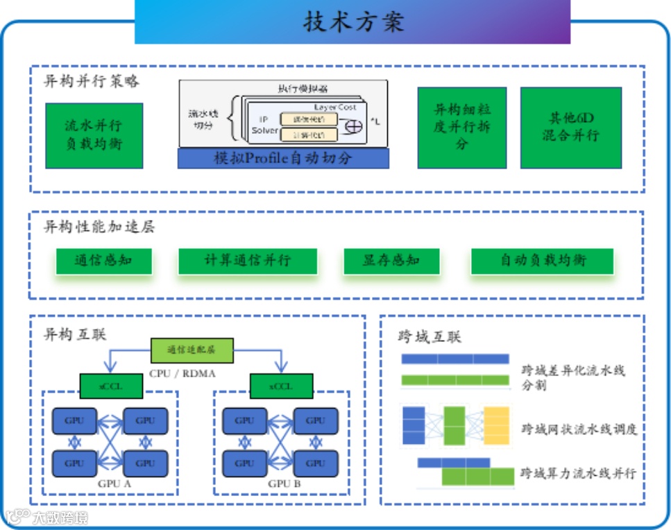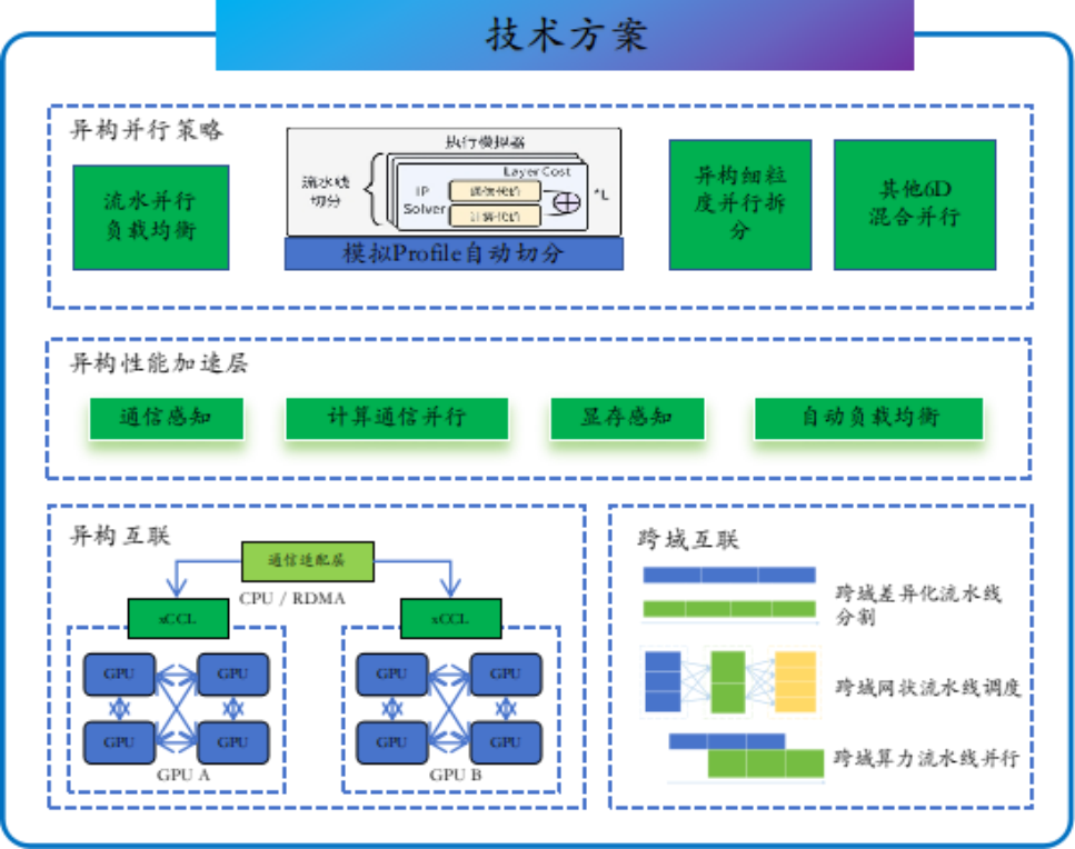 针对跨域算力资源的联合训练问题,本实验基于通信拓扑感知、资源感知、计算与通信并行的方法,提高算力资源与跨域通信资源的利用率,加速模型训练。此外,本实验基于差异化流水线分割、网状流水线调度、异构流水线非均匀并行等方式构建了负载均衡的模型训练流水线并行方法,进一步提高了异构算力与网络资源场景下的模型训练吞吐率,跨域异构混训效率可达90%。