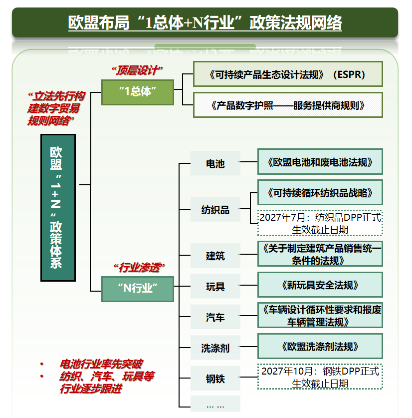 在全球产品数字护照的发展格局中,欧盟已率先构建起相对系统的政策法规体系,目前已形成“1总体+N行业”的产品数字护照政策体系。一是欧盟出台总体框架性立法。欧盟《可持续产品生态设计法规》(ESPR)于2024年7月18日正式生效,作为总体法规对进入欧盟市场交易和流通的产品提出更加严格的生态设计要求,其中产品数字护照是ESPR最重要的一部分。2024年11月12日,欧盟委员会宣布就制定《产品数字护照——服务提供商规则》法规启动影响评估,旨在确保DPP系统的可靠性和安全性,并为欧盟范围内DPP服务提供商创造公平竞争的环境。同时ESPR将分批释放管控产品名单,预计2025年上半年发布第一个工作计划,将优先考虑电池、纺织品、电子电器、钢铁、铝、家具、轮胎、洗涤剂、油漆、润滑剂、化学品、能源相关产品以及信息通信技术产品等。二是欧盟分行业推进产品数字护照。《欧盟电池和废电池法规》《可持续循环纺织品战略》《关于制定建筑产品销售统一条件的法规》《新玩具安全法规》《车辆设计循环性要求和报废车辆管理法规》5部行业性政策法规明确要求实施产品数字护照。其中,已明确2027年2月18日后,投放欧盟市场的LMT电池、工业电池(容量大于2kWh)和电动汽车电池应具有电池数字护照;预计2026年1月欧盟议会将发布关于纺织品DPP授权法案,预计2027年7月纺织品DPP将会生效。