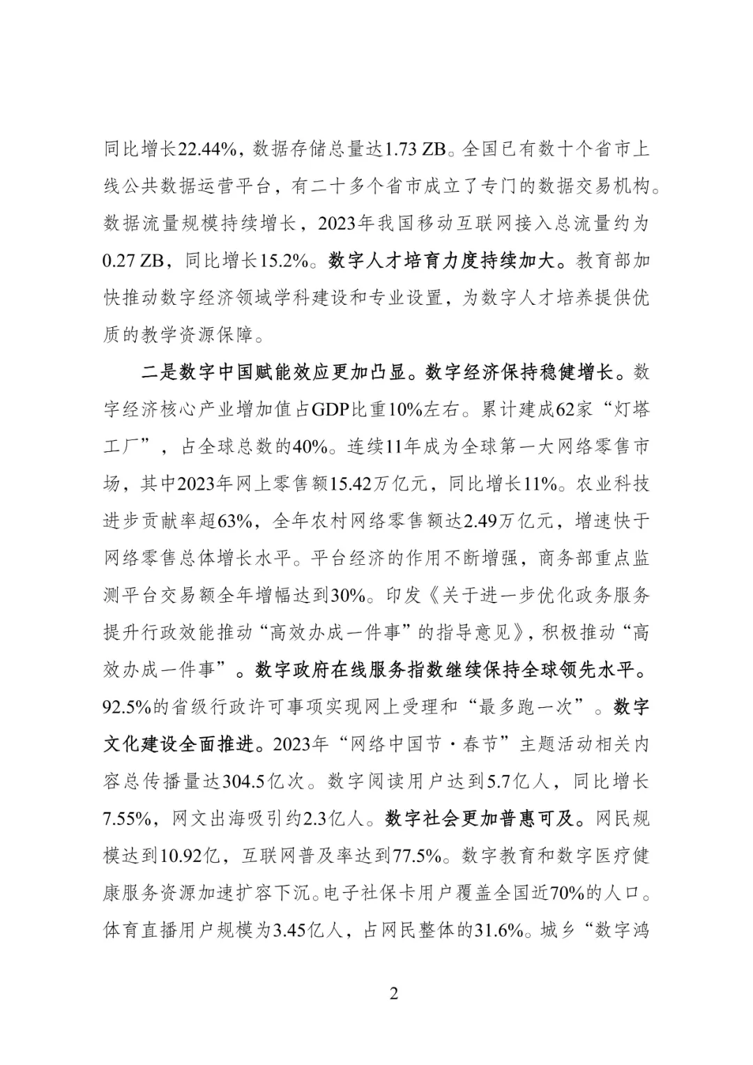 为贯彻落实党中央、国务院关于建设数字中国的重要部署,国家数据局会同有关方面系统总结2023年数字中国建设取得的重要进展和工作成效,展望2024年数字中国发展情况,编制形成《数字中国发展报告(2023年)》并正式发布。