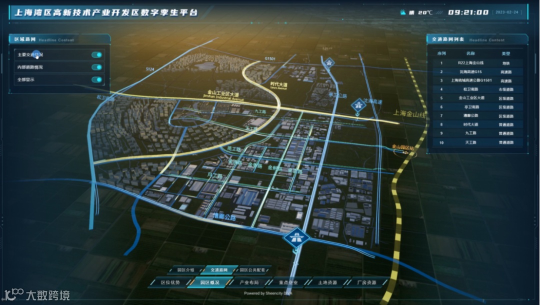 2023年1月,根据上海湾区高新技术产业开发区业务需求,制作数字孪生展示平台建设,展示了园区的概况、交通、配套设施、产业布局和资源等不同管理切片信息,满足园区的招商引资和展示需求。在招商选地和选厂房环节,直观地展示园区资源的地理位置和设施配套情况,提高招商效率和效益,并为未来数字园区建设提供数字空间基底建设铸造。